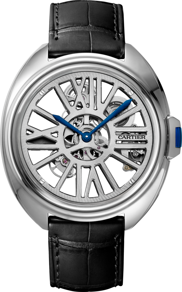 Đồng hồ tự động khung xương Clé de Cartier, Sản xuất bộ máy cơ tự lên dây, cỡ nòng 9621 MC. Vỏ Palladium 950‰, bộ chìa khóa palladium 950‰ với kim hình thanh kiếm bằng thép xanh, sapphire. Dây đeo bằng da cá sấu màu đen, khóa gập đôi có thể điều chỉnh bằng vàng trắng 18K. Giờ, phút, với các cầu nối có khung tạo thành chữ số La Mã và quả cân dao động bằng vàng 22K được khung khung. Bộ chuyển động được đánh số riêng bao gồm 165 bộ phận trong đó có 28 chân kính. Đường kính bộ máy: 31,63 mm, độ dày bộ máy: 5,66 mm, độ cân bằng: 28.800 rung động/giờ, dự trữ năng lượng xấp xỉ. 48 giờ. Mặt kính sapphire và vỏ sau. Độ dày vỏ: 11,45 mm. Chống nước ở áp suất 3 bar (khoảng 30 mét/100 feet).