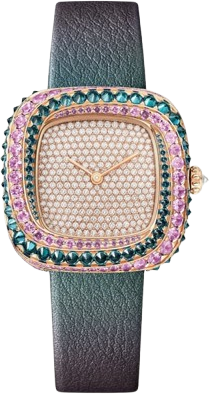 Đồng hồ Coussin de Cartier: một hình vuông nằm giữa vòng xoáy kim cương xoắn ốc. Một chiếc đồng hồ dành cho buổi tối, tạo nên sự khác biệt. Phiên bản trung bình, bộ máy Quartz, vỏ vàng hồng 18K (750/1000) đính đá tourmaline và sapphire hồng. Kim hình thanh kiếm bằng thép mạ vàng. Mặt số và núm vặn bằng vàng hồng 18K (750/1000) đính 259 viên kim cương cắt brilliant, tổng cộng 1,19 carat. Dây da bê màu tím. Khóa ardillon bằng vàng hồng 18K (750/1000) đính 21 viên kim cương, tổng cộng 0,21 carat. Kích thước vỏ: 30,4 mm x 31,1 mm. Độ dày: 7,1 mm. Khả năng chống nước lên đến 3 bar (khoảng 30 mét/100 feet).