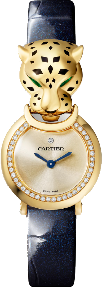 Là nữ thần thời gian, báo đen mang đến sức hút cho những chiếc đồng hồ trang sức của Cartier và tạo nên nhiều biến thể khác nhau. Kết hợp giữa thế giới đồng hồ và trang sức, những chiếc đồng hồ lai này ra đời từ bàn tay của một nghệ nhân, người có chuyên môn về đính đá quý và sơn mài, tạo nên nét độc đáo riêng biệt. Đồng hồ Panthère de Cartier, bộ máy thạch anh. Vỏ vàng vàng 18K (750/1000) đính 40 viên kim cương cắt brilliant tổng cộng 0,24 carat, đầu báo vàng vàng 18K (750/1000), mắt báo tsavorite cắt hình quả lê, đốm và mũi sơn mài đen, mặt số vàng, kim hình thanh kiếm bằng thép xanh, dây đeo cá sấu xanh navy bóng, khóa ardillon vàng vàng 18K (750/1000). Đường kính vỏ: 23,6 mm. Độ dày: 7,8 mm. Khả năng chống nước lên đến 3 bar (khoảng