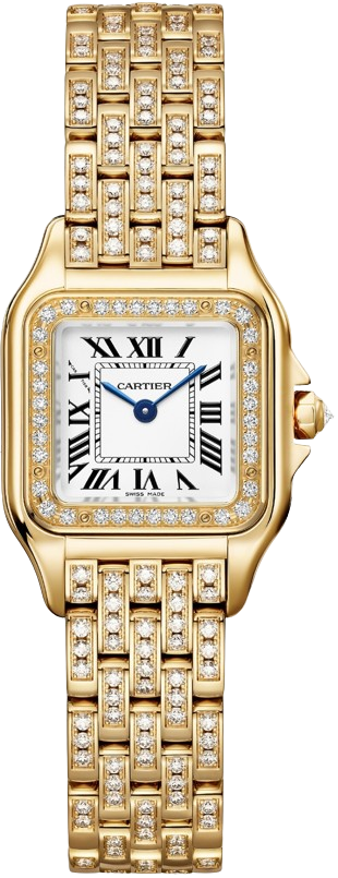 Được thiết kế vào những năm 1980, đồng hồ Panthère de Cartier lấy tên từ chiếc vòng tay cùng tên. Cấu trúc siêu linh hoạt của nó mô phỏng chuyển động của loài động vật biểu tượng của Maison. Vừa là đồng hồ vừa là món đồ trang sức, đây thực sự là biểu tượng thời trang dành cho phụ nữ có phong cách táo bạo. KÍCH THƯỚC 30,3 mm x 22,0 mm. Đồng hồ Panthère de Cartier, mẫu nhỏ, bộ máy thạch anh. Vỏ vàng vàng 18K (750/1000) đính 36 viên kim cương cắt sáng rực rỡ tổng cộng 0,25 carat. Kích thước: 30,3 mm x 22 mm, độ dày: 6,05 mm. Núm vặn hình bát giác bằng vàng vàng 18K (750/1000) đính một viên kim cương cắt sáng rực rỡ tổng cộng 0,02 carat. Mặt số màu bạc, kim hình thanh kiếm bằng thép xanh. Vòng tay vàng vàng 18K (750/1000), đính bán phần 142 viên kim cương cắt brilliant, tổng cộng 1,29 carat. Khả năng chống nước lên đến 3 bar (khoảng 30 mét/100 feet).