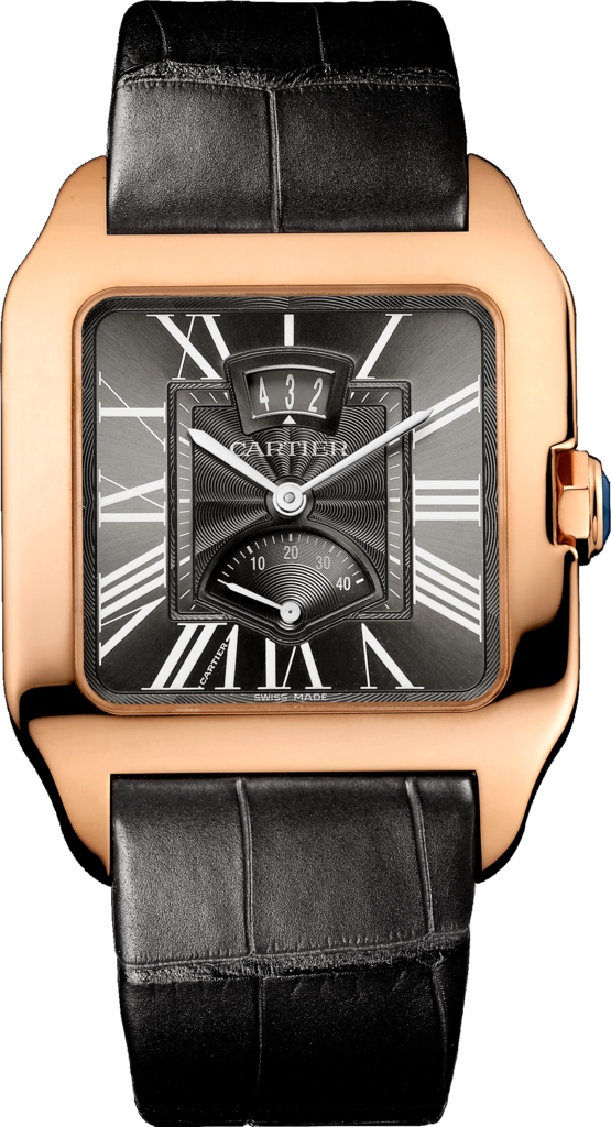 Đồng hồ Santos Dumont, mẫu lớn, Sản xuất bộ máy cơ lên dây thủ công Cartier cỡ nòng 9753 MC. Vỏ bằng vàng hồng 18K, vương miện hình bát giác với mặt sapphire, mặt số flinqué mạ kẽm màu xám, chữ số La Mã, kim hình thanh kiếm bằng thép rhodium, mặt kính sapphire, dây đeo bằng da cá sấu bán mờ màu xám, khóa gấp bằng vàng hồng 18K có thể điều chỉnh đôi, khẩu độ lịch lúc 12 giờ, dự trữ năng lượng lúc 6 giờ, kích thước vỏ: 38 mm x 47,4 mm, độ dày: 9,3 mm. Chống nước ở áp suất 3 bar (30 mét/100 feet).