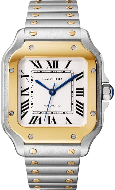 Năm 1904, Louis Cartier đã thực hiện mong ước của phi công nổi tiếng người Brazil Alberto Santos Dumont: có thể xem giờ khi đang bay. Sự ra đời của một trong những chiếc đồng hồ đeo tay đầu tiên đã gắn kết tình bạn giữa hai người tiên phong này. Các góc bo tròn của mặt số, đường cong liền mạch của sừng và các ốc vít lộ ra đã tạo nên một chiếc đồng hồ mang tính biểu tượng, truyền cảm hứng cho vô số cách diễn giải lại. Kích thước 41,9 mm x 35,1 mm. Chất liệu vàng và thép. Núm vặn màu xanh. Khả năng chống nước lên đến 10 bar (~100 mét). Kính hình vuông. Chất liệu mặt sau bằng thép. Độ dày vỏ 8,82 mm. Chức năng đồng hồ: Mặt số phụ hiển thị giây nhỏ. Giờ phút. Bộ máy cơ tự động lên dây cót. Kim hình thanh kiếm. Màu kim màu xanh. Chất liệu kim thép không hợp kim.