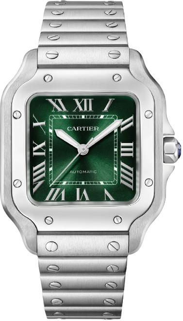Năm 1904, Louis Cartier đã thực hiện được mong ước của phi công lừng danh người Brazil Alberto Santos Dumont: có thể xem giờ ngay cả khi đang bay. Sự ra đời của một trong những chiếc đồng hồ đeo tay đầu tiên đã gắn kết tình bạn giữa hai người tiên phong này. Các góc bo tròn của mặt số, đường cong liền mạch của sừng và các ốc vít lộ ra tạo nên một chiếc đồng hồ mang tính biểu tượng, truyền cảm hứng cho vô số cách diễn giải lại. Đồng hồ Santos de Cartier. Mẫu trung bình. Bộ máy cơ với vỏ Mc.Steel 1847 lên cót tự động. Núm điều chỉnh 7 mặt với spinel xanh lam tổng hợp nhiều mặt. Mặt số màu xanh lá cây chuyển tiếp. Kim hình thanh kiếm bằng thép đánh bóng với vật liệu phát quang. Pha lê Sapphire. Dây đeo bằng thép với hệ thống điều chỉnh SmartLink. Dây đeo thứ hai bằng da cá sấu xanh lá cây. Khóa gấp bằng thép có thể thay đổi. Cả hai đều được trang bị hệ thống QuickSwitch có thể thay đổi. Chiều rộng vỏ: 35,1 mm. Độ dày: 8,83 mm. Chống nước lên đến 10 bar (khoảng 100 mét/330 feet)