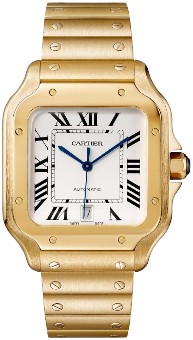Năm 1904, Louis Cartier đã thực hiện được mong ước của phi công lừng danh người Brazil Alberto Santos Dumont: có thể xem giờ ngay cả khi đang bay. Sự ra đời của một trong những chiếc đồng hồ đeo tay đầu tiên đã gắn kết tình bạn giữa hai người tiên phong này. Các góc bo tròn của mặt số, đường cong liền mạch của sừng và các ốc vít lộ ra tạo nên một chiếc đồng hồ mang tính biểu tượng sẽ truyền cảm hứng cho vô số cách diễn giải lại. Đồng hồ Santos. Mẫu lớn. Bộ máy cơ học với dây cót tự động. Caliber 1847 Mc. Vỏ vàng vàng 750/1000. Núm điều chỉnh 7 mặt vàng vàng 750/1000 được đính đá sapphire nhiều mặt. Mặt số opaline mạ bạc. Kim hình thanh kiếm bằng thép xanh. Pha lê sapphire. Dây đeo bằng vàng vàng 750/1000 với hệ thống điều chỉnh "SmartLink". Dây đeo thứ hai bằng da cá sấu. Khóa gấp vàng vàng 750/1000 có thể thay đổi được. Cả hai dây đeo đều được trang bị hệ thống thay đổi được "QuickSwitch". Chiều rộng vỏ: 39,8 mm. Độ dày: 9,38 mm. Chống nước lên đến 10 bar (khoảng 100 mét/328 feet)