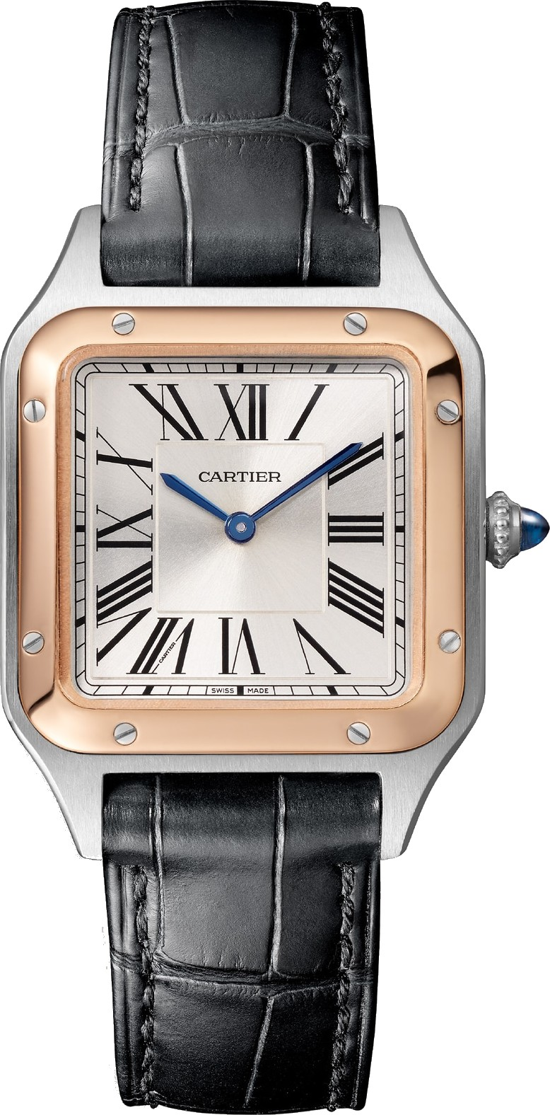 Năm 1904, Louis Cartier đã thực hiện được mong ước của phi công nổi tiếng người Brazil Alberto Santos Dumont: có thể xem giờ khi đang bay. Sự ra đời của một trong những chiếc đồng hồ đeo tay đầu tiên đã gắn kết tình bạn giữa hai người tiên phong này. Các góc bo tròn của mặt số, đường cong liền mạch của sừng và các ốc vít lộ ra đã tạo nên một chiếc đồng hồ mang tính biểu tượng, truyền cảm hứng cho vô số phiên bản khác nhau. Mô tả sản phẩm: Đồng hồ Santos-Dumont. Mẫu nhỏ. Bộ máy thạch anh tự động cao (~ 6 năm). Vỏ thép. Vành vàng hồng 18K (750/1000). Núm điều chỉnh bằng hạt thép được đính đá spinel tổng hợp màu xanh lam hình cabochon. Mặt số bạc chải satin với hiệu ứng tia nắng. Số La Mã. Kim hình thanh kiếm bằng thép xanh. Mặt kính sapphire. Dây đeo bằng da cá sấu màu đen. Khóa ardillon bằng thép. Kích thước vỏ: 38 mm x 27,5 mm. Độ dày: 7,3 mm. Khả năng chống nước lên đến 3 bar (khoảng 30 mét/100 feet).
