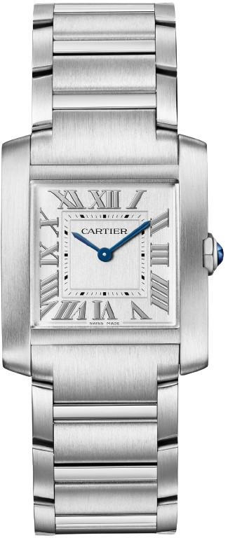 Được thiết kế bởi Louis Cartier vào năm 1917, đồng hồ Tank là biểu tượng của ngành chế tác đồng hồ hiện đại. Thiết kế tinh tế của chiếc đồng hồ đeo tay này, kết hợp hình học với tỷ lệ chính xác, tạo nên bản sắc đậm nét. Dễ dàng nhận biết và luôn bắt kịp thời đại, Tank đã được tái hiện qua hơn một thế kỷ với vô số biến thể vẫn trung thành với tinh thần của thiết kế ban đầu: Tank Cintrée, Tank Chinoise, Tank Américaine, Tank Française... Đồng hồ Tank Française. Mẫu trung bình. Bộ máy thạch anh. Vỏ thép. Núm vặn mặt thép được trang trí bằng đá spinel tổng hợp hình cabochon. Mặt số mạ bạc. Kim hình thanh kiếm bằng thép xanh. Mặt kính sapphire. Dây đeo bằng thép. Kích thước vỏ: 32 mm x 27 mm. Độ dày: 7,1 mm. Khả năng chống nước ở độ sâu 3 bar (khoảng 30 mét/100 feet).