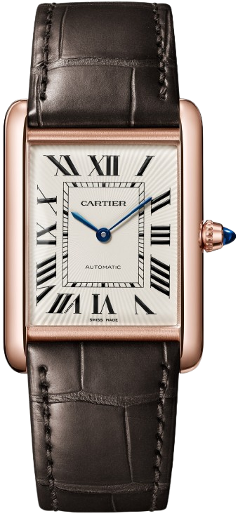 Được thiết kế bởi Louis Cartier vào năm 1917, đồng hồ Tank là biểu tượng của ngành chế tác đồng hồ hiện đại. Thiết kế thanh lịch của chiếc đồng hồ đeo tay này, kết hợp hình học với tỷ lệ chính xác, định hình nên bản sắc táo bạo của nó. Dễ dàng nhận ra ngay lập tức và luôn đồng điệu với thời đại, Tank đã được tái hiện trong hơn một thế kỷ qua với vô số biến thể vẫn trung thành với tinh thần của thiết kế ban đầu: Tank Cintrée, Tank Chinoise, Tank Américaine, Tank Française... Đồng hồ Tank Louis Cartier, mẫu lớn, bộ máy cơ tự động lên dây cót, cỡ nòng 1899 MC. Vỏ bằng vàng hồng 18K (750/1000). Kích thước: 38,1 x 27,75 mm, độ dày: 8,18 mm. Mặt số bạc được đóng dấu với vecni vàng. Núm điều chỉnh bằng vàng hồng 18K (750/1000) đính hạt đính đá sapphire cabochon. Kim hình thanh kiếm bằng thép xanh. Dây đeo bằng da cá sấu màu nâu bán mờ. Chống nước ở độ sâu lên tới 3 bar (khoảng 30 mét/100 feet).