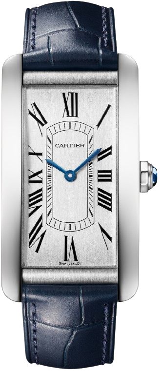 Được thiết kế bởi Louis Cartier vào năm 1917, đồng hồ Tank là biểu tượng của ngành chế tác đồng hồ hiện đại. Thiết kế tinh tế của chiếc đồng hồ đeo tay này, kết hợp hình học với tỷ lệ chính xác, định hình nên bản sắc táo bạo của nó. Dễ dàng nhận ra ngay lập tức và luôn bắt kịp thời đại, Tank đã được tái hiện trong hơn một thế kỷ qua với vô số biến thể vẫn trung thành với tinh thần của thiết kế ban đầu: Tank Cintrée, Tank Chinoise, Tank Américaine, Tank Française... Đồng hồ Tank Américaine. Mẫu lớn. Bộ máy cơ tự động lên dây cót. Vỏ thép. Núm vặn mặt cắt với đá spinel xanh tổng hợp nhiều mặt cắt. Mặt số bạc chải satin. Kim hình thanh kiếm bằng thép xanh. Mặt kính sapphire. Dây da cá sấu xanh navy bán mờ. Khóa gập bằng thép có thể thay đổi. Kích thước vỏ: 44,4 mm x 24,4 mm. Độ dày: 8,6 mm. Khả năng chống nước lên đến 3 bar (khoảng 30 mét/100 feet)