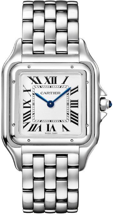 Được thiết kế vào những năm 1980, đồng hồ Panthère de Cartier lấy tên từ chiếc vòng đeo tay cùng tên. Cấu trúc siêu linh hoạt của nó mô phỏng chuyển động của loài động vật biểu tượng của Maison. Vừa là đồng hồ vừa là trang sức. Đồng hồ Panthère de Cartier. Mẫu lớn. Bộ máy thạch anh. Vỏ thép. Kích thước: 31 mm x 42 mm. Độ dày: 6,71 mm. Vỏ thép. Núm vặn đính đá spinel tổng hợp màu xanh. Mặt số mạ bạc. Kim hình thanh kiếm bằng thép xanh. Dây đeo thép. Độ chống nước lên đến 3 bar (khoảng 30 mét/100 feet).