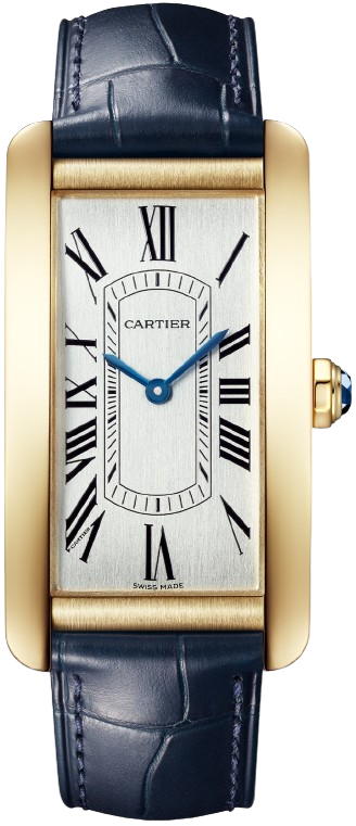 Được Louis Cartier thiết kế vào năm 1917, đồng hồ Tank là một biểu tượng của ngành chế tác đồng hồ hiện đại. Thiết kế thanh lịch của chiếc đồng hồ đeo tay này, kết hợp giữa hình học và tỷ lệ chính xác, đã tạo nên bản sắc mạnh mẽ của nó. Dễ dàng nhận biết và luôn bắt kịp xu hướng thời đại, dòng đồng hồ Tank đã được tái hiện qua hơn một thế kỷ với nhiều phiên bản khác nhau nhưng vẫn giữ nguyên tinh thần của thiết kế ban đầu: Tank Cintrée, Tank Chinoise, Tank Américaine, Tank Française... Đồng hồ Tank Américaine. Phiên bản cỡ lớn. Bộ máy cơ tự động lên dây. Vỏ bằng vàng 18K (750/1000). Núm vặn được đính đá sapphire mài giác. Mặt số mạ bạc chải satin. Kim chỉ giờ và phút hình kiếm bằng thép xanh. Mặt kính sapphire. Dây đeo bằng da cá sấu màu xanh hải quân bán mờ. Khóa gập bằng vàng 18K (750/1000) có thể thay thế. Kích thước vỏ: 44,4 mm x 24,4 mm. Độ dày: 8,6 mm. Chống nước đến 3 bar (khoảng 30 mét/100 feet)