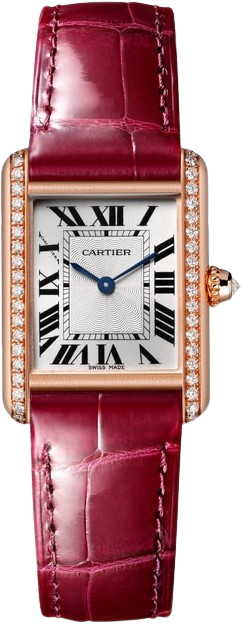 Được Louis Cartier thiết kế vào năm 1917, đồng hồ Tank là một biểu tượng của ngành chế tác đồng hồ hiện đại. Thiết kế thanh lịch của chiếc đồng hồ đeo tay này, kết hợp giữa hình học và tỷ lệ chính xác, đã tạo nên bản sắc mạnh mẽ của nó. Dễ dàng nhận biết và luôn bắt kịp xu hướng thời đại, dòng đồng hồ Tank đã được tái hiện trong hơn một thế kỷ với nhiều phiên bản khác nhau nhưng vẫn giữ nguyên tinh thần của thiết kế ban đầu: Tank Cintrée, Tank Chinoise, Tank Américaine, Tank Française... Đồng hồ Tank Louis Cartier. Mẫu nhỏ. Bộ máy cơ khí sản xuất thủ công. Vỏ và núm vặn bằng vàng hồng 18K (750/1000) đính 41 viên kim cương cắt brilliant tổng cộng 0,47 carat. Mặt số vân bạc. Kim chỉ giờ và phút hình kiếm bằng thép xanh. Mặt kính khoáng. Dây đeo bằng da cá sấu màu đỏ tía. Khóa Ardillon bằng vàng hồng 18K (750/1000). Kích thước vỏ: 29,5 mm x 22,0 mm. Độ dày: 6,8 mm. Chống nước đến 3 bar (khoảng 30 mét/100 feet)