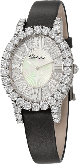 Với những đường cong duyên dáng và sự lấp lánh rực rỡ, chiếc đồng hồ L'Heure du Diamant bằng vàng trắng 18k và kim cương này là chiếc đồng hồ nữ tính sang trọng. Hình bầu dục tròn của mặt số guilloché nạm kim cương được bao quanh bởi viền nạm kim cương trên dây đeo sa tanh mềm mại. Một sự thể hiện rực rỡ của sự sang trọng, phong cách và sự khéo léo của Chopard.