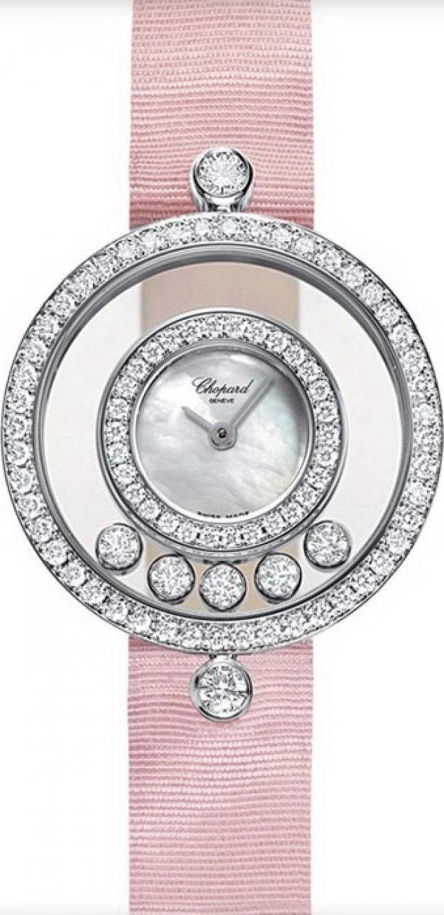 Vỏ có thiết kế độc đáo được làm bằng vàng trắng 18K và viền tròn làm từ cùng chất liệu và đính kim cương, là điểm nổi bật của chiếc đồng hồ Chopard Happy Diamonds Round này. Vẻ ngoài cá tính của vỏ mang đến cho chiếc đồng hồ vẻ ngoài hiện đại, nữ tính và sang trọng. . Dây đeo chắc chắn và thoải mái của đồng hồ được làm bằng vải satin màu hồng và có móc cài tang. Vô số những viên kim cương nhảy múa xung quanh mặt số màu trắng của Đồng hồ biểu tượng kim cương hạnh phúc mang lại cho nó một vẻ ngoài rất bắt mắt.
