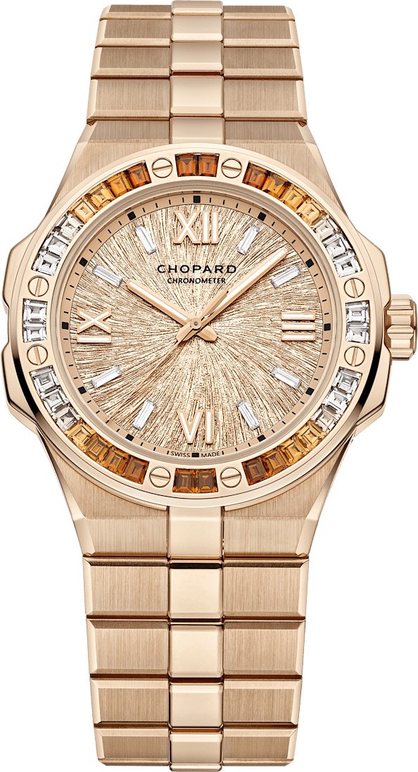 Bộ sưu tập Alpine Eagle chào đón loạt đồng hồ mới đường kính 36 mm với mặt số phát quang và vành bezel đính đá quý theo kiểu chuyển sắc. Được chế tác từ vàng hồng 18 carat có nguồn gốc bền vững, vành bezel được đính đá garnet spessartite cắt hình thang và sapphire trắng. Vừa tiên tiến về mặt kỹ thuật, vừa đẹp mắt về mặt thẩm mỹ, mẫu đồng hồ này được trang bị bộ máy tự động Chopard 09.01-C và khả năng dự trữ năng lượng 42 giờ. Chất liệu kim loại: Vàng hồng 18K có nguồn gốc đạo đức. Đường kính vỏ: 36mm. Độ dày: 8,40mm. Mặt số: Màu Hồng Bình Minh (Pink Dawn) được tạo ra thông qua xử lý mạ điện - thiết kế hoàn thiện lấy cảm hứng từ mống mắt của chim đại bàng - các vạch chỉ giờ được đính kim cương cắt hình chữ nhật. Chống nước: 100 mét. Mặt sau: Kính sapphire trong suốt. Chất liệu núm vặn: Vàng hồng 18K có nguồn gốc đạo đức. Loại núm vặn: Núm vặn kiểu vít. Mặt kính: Kính sapphire. Dù ở thành phố hay trên núi, chiếc đồng hồ Alpine Eagle này đều có thể dựa vào độ tin cậy của bộ máy tự động, có thể nhìn thấy qua mặt sau lộ máy. Bộ máy Chopard Calibre 09.01-C được chế tác bởi các nghệ nhân của hãng từ 159 chi tiết. Nó tuân thủ các thông số kỹ thuật nghiêm ngặt, đảm bảo khả năng dự trữ năng lượng 42 giờ và độ tin cậy tuyệt vời. Với đường kính chỉ 8 ligna, đây là một trong những chiếc đồng hồ nhỏ nhất được Viện Kiểm định Đồng hồ bấm giờ Thụy Sĩ chính thức cấp chứng nhận độ chính xác danh giá, mang đến cho chiếc đồng hồ này một nét đặc biệt riêng. Bộ máy CHOPARD 09.01-C. Loại lên dây: Cơ khí tự động. Chức năng: Giờ, phút và giây. Thời gian dự trữ năng lượng: Khoảng 42 giờ. Chứng nhận: Đồng hồ bấm giờ được chứng nhận (COSC). Tần số: 3,5 Hz (25.200 dao động mỗi giờ). Lò xo cân bằng: Phẳng. Bánh xe cân bằng: Ba nan hoa. Độ dày bộ máy: 3,65. Số lượng bộ phận của bộ máy: 149. Số chân kính: 27. Loại khóa: Khóa gập