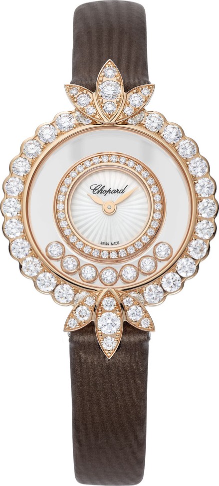 Đồng hồ Chopard Happy Diamonds Joaillerie Rose Gold Quartz 29 mm. Tham khảo mẫu: 209424-5004. Vỏ bằng vàng hồng (hồng) 18K đính kim cương. Mặt số xà cừ đính kim cương. Chuyển động thạch anh. Dây đeo dệt màu nâu có khóa chốt.