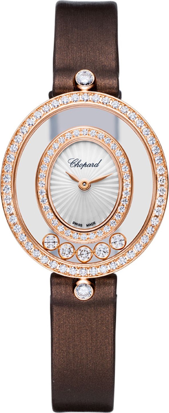 Những viên kim cương lấp lánh nhảy múa dễ dàng xung quanh mặt số guilloché xà cừ của Đồng hồ biểu tượng Happy Diamonds này bằng vàng hồng 18k trên dây đeo bằng da. Trong một màn trình diễn trong suốt tuyệt đẹp, những viên kim cương chuyển động mang tính biểu tượng của Chopard xoay tròn giữa hai tinh thể sapphire nằm trong vỏ hình bầu dục được chế tác tinh xảo, mang đến sự thể hiện lộng lẫy của ánh sáng, tình yêu và sự tự do.