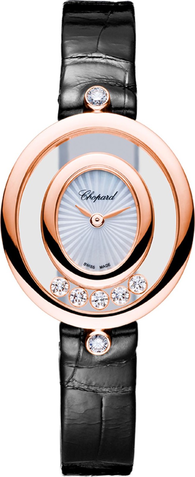 Những viên kim cương lấp lánh nhảy múa dễ dàng xung quanh mặt số guilloché xà cừ của Đồng hồ biểu tượng Happy Diamonds này bằng vàng hồng 18k trên dây đeo bằng da. Trong một màn trình diễn trong suốt tuyệt đẹp, những viên kim cương chuyển động mang tính biểu tượng của Chopard xoay tròn giữa hai tinh thể sapphire nằm trong vỏ hình bầu dục được chế tác tinh xảo, mang đến sự thể hiện lộng lẫy của ánh sáng, tình yêu và sự tự do.