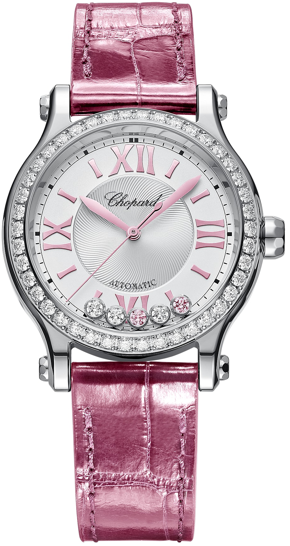 Bộ sưu tập Happy Sport là biểu tượng cho sự sáng tạo và táo bạo của Chopard. Những viên đá quý lấp lánh, xoay tự do, nhảy múa giữa hai lớp kính sapphire, đã thu hút trí tưởng tượng kể từ năm 1993, khi Chopard trở thành thương hiệu đầu tiên kết hợp thép và kim cương. Kinh nghiệm chế tác đồng hồ đã cho phép Chopard trang bị cho Happy Sport 33 mm bộ máy cơ tự động lên dây cót được phát triển đặc biệt dành cho đồng hồ nữ. Những viên kim cương nhỏ làm nên những điều tuyệt vời. Chất liệu: Thép không gỉ. Đường kính vỏ: 33 mm. Độ dày: 10,84 mm. Chống nước: 30 mét. Mặt sau: Kính sapphire trong suốt. Chất liệu núm vặn: Thép không gỉ. Mặt kính: Kính sapphire. Nhờ kinh nghiệm chế tác đồng hồ, Chopard đã trang bị cho một số mẫu đồng hồ nữ của mình bộ máy cơ tự động lên dây cót 09.01-C, được phát triển và sản xuất ngay tại nhà máy của hãng. Thành tựu kỹ thuật, sức quyến rũ, vẻ nữ tính tuyệt đỉnh: chiếc đồng hồ này hội tụ đầy đủ mọi yếu tố và không hề thỏa hiệp. Bộ máy CHOPARD 09.01-C. Loại cơ chế lên dây: Cơ khí tự động. Chức năng: Giờ, phút và giây. Dự trữ năng lượng: Khoảng 42 giờ. Tần số: 3.5 Hz (25.200 dao động/giờ). Trang trí trên các cầu nối bộ máy: Được trang trí bằng họa tiết Côtes de Genève, tấm đế chính được hoàn thiện bằng kỹ thuật mài tròn. Lò xo cân bằng: Phẳng. Bánh xe cân bằng: Ba nan hoa. Độ dày bộ máy: 3.65 mm. Số lượng chi tiết bộ máy: 149. Số chân kính: 27. Loại dây đeo: Dây đeo kim loại. Loại khóa: Khóa ghim. Chất liệu khóa: Thép không gỉ. Dây đeo: Dây da cá sấu màu hồng với đường chỉ khâu cùng màu. Phiên bản giới hạn: 250 chiếc.