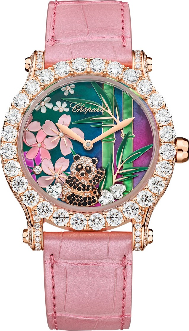 Phiên bản giới hạn 8 chiếc. Chopard tôn vinh tình yêu cuộc sống thông qua chiếc đồng hồ đặc biệt này, được sản xuất với số lượng giới hạn 8 chiếc, nhằm tri ân loài gấu trúc, một loài động vật rất đáng được bảo tồn. Được trang bị bộ máy Chopard Calibre 96.23-L với khả năng dự trữ năng lượng 65 giờ, chế tác từ vàng có nguồn gốc đạo đức, được trang trí thủ công tinh xảo và hoàn toàn đính đá quý lấp lánh, đây là tinh hoa của mọi chuẩn mực xuất sắc hiện có trong cả chế tác đồng hồ và trang sức. Chất liệu: Vàng hồng 18K có nguồn gốc đạo đức. Độ dày: 13,63 mm. Kim cương trắng: 8,94 ct. Mặt sau: Kính sapphire trong suốt. Chất liệu núm vặn: Vàng hồng 18K có nguồn gốc đạo đức. Một bộ máy đặc biệt là cần thiết để tạo nên một tác phẩm tuyệt vời về đời sống động vật và khoáng vật. Trái tim của chiếc vỏ này, được trang trí lộng lẫy bởi các nghệ nhân kim hoàn nội bộ, là bộ máy cơ tự động Chopard 96.23-L. Được phát triển từ bộ máy đầu tiên (L.U.C 96.01-L) do Chopard Manufacture giới thiệu năm 1997, phiên bản cải tiến mới nhất này được trang bị hai hộp cót mắc nối tiếp, cho phép đồng hồ tích lũy khả năng dự trữ năng lượng lên đến 65 giờ nhờ công nghệ Chopard Twin. Nó cũng được trang bị một rôto siêu nhỏ bằng bạch kim, đảm bảo việc lên dây cót hoàn hảo đồng thời tiết kiệm không gian trong vỏ đồng hồ. Được tô điểm bằng những viên đá quý tương tự như mặt số đi kèm, bộ máy được lộ ra qua mặt sau lộ máy của vỏ vàng 18 carat nguyên chất, qua đó hé lộ vẻ đẹp tinh tế và tinh túy của tay nghề chế tác đồng hồ được thực hiện bởi các nghệ nhân của Chopard. Bộ máy L.U.C 96.23-L6. Loại lên dây cót: Bộ máy cơ tự động. Thời gian dự trữ năng lượng: Khoảng 65 giờ, công nghệ L.U.C Twin (hai hộp cót xếp chồng lên nhau). Tần số: 4 Hz (28.800 dao động mỗi giờ). Độ dày bộ máy: 3,30 mm. Số chân kính: 29. Loại dây đeo: Dây đeo kim loại. Loại khóa: Khóa ghim. Chất liệu khóa: Vàng hồng 18K nguyên chất. Dây đeo: Dây da cá sấu màu hồng sang trọng với đường chỉ khâu cùng màu.