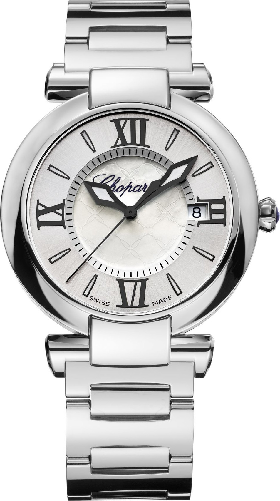 Đồng hồ IMPERIALE bằng thép không gỉ là thiết kế tinh tế tối ưu. Trên mặt số có tông màu bạc cân đối, các kim cong tinh xảo lấy cảm hứng từ thời đại Đế chế và các chữ số La Mã đế quốc chỉ huy thời gian, trong khi ánh sáng quý phái của cabochon thạch anh tím trên núm vặn gợi lên màu tím hoàng gia của triều đình Byzantine.