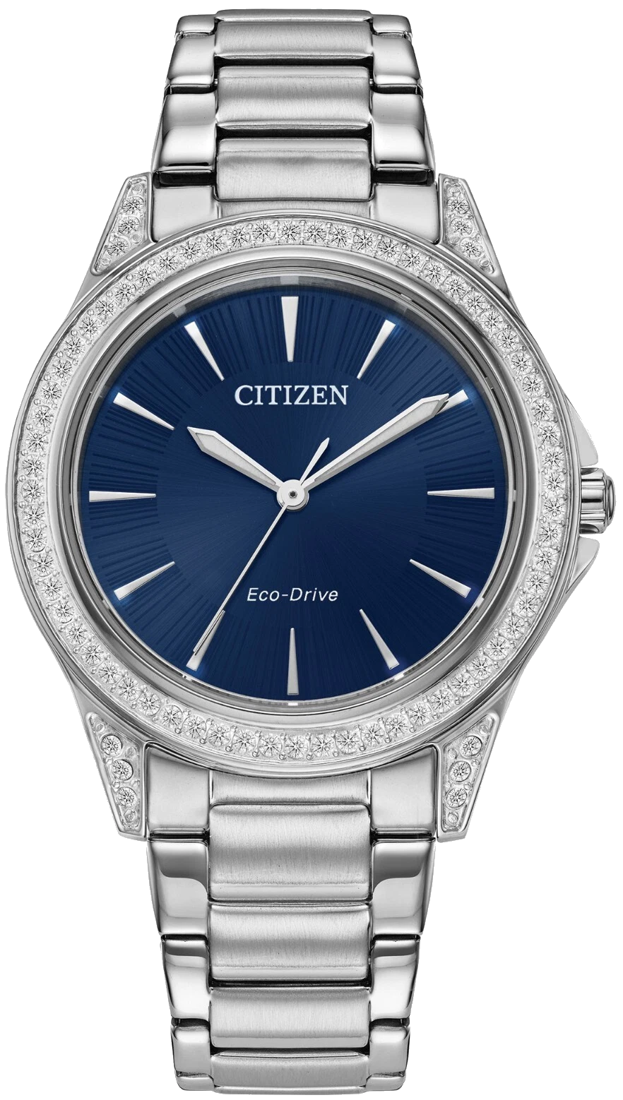 Đặc điểm: 3 kim, mặt số 12 giờ, kim giây trung tâm, điểm xuyết kim cương, tinh thể khoáng, đính đá quý. Kích thước vỏ 34 mm. Dành cho nữ. Màu vỏ bạc. Màu vành bezel bạc. Chất liệu vỏ Thép không gỉ. Khả năng chống nước 30 m (3 ATM). Mẫu Classic Eco. Chất liệu dây đeo. Thép không gỉ. Màu mặt số xanh dương. Dây đeo/dây đeo tay. Màu dây đeo bạc. Thương hiệu Citizen. Phong cách: Trang trọng/Trang trọng. Hình dạng đồng hồ: Tròn. Bộ máy: Eco-Drive. Loại: Đồng hồ đeo tay.