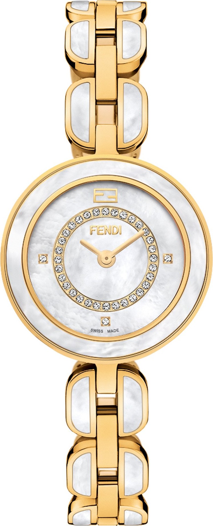 Dòng Fendi, My Way có vỏ bằng thép không gỉ 28mm, viền cố định, mặt số bằng ngọc trai và mặt kính sapphire chống trầy xước.