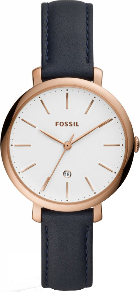 Chiếc Jacqueline 36mm này có mặt số màu trắng mờ với các cọc số, chuyển động ngày ba kim và dây đeo bằng da màu hải quân.