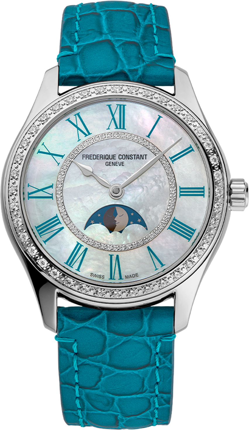Hiển thị trên mặt số ở vị trí 6 giờ, hình ảnh mặt trăng có thiết kế độc quyền dành cho Frederique Constant. Dao động giữa các sắc thái xám nhạt và đậm, hai nửa mặt trăng như đang hôn nhau. Màu sắc nhẹ nhàng và tinh tế của mặt trăng được lựa chọn để phù hợp với họa tiết trang trí của đồng hồ. Vỏ thép với điểm nhấn bạc được kết hợp với kim thép phía trên mặt số khảm xà cừ. Vẻ cổ điển của bố cục này càng được tôn lên bởi vòng giờ mới, trong đó các chữ số Ả Rập truyền thống được thay thế bằng các chữ số La Mã thanh mảnh và duyên dáng. Lần đầu tiên trong bộ sưu tập, các chữ số này được làm bằng cùng màu xanh denim với dây đeo da khâu chỉ nổi, tạo nên dấu ấn phong cách độc quyền cho bộ sưu tập này – và là điều hiếm thấy trong ngành chế tạo đồng hồ nói chung. Bộ máy FC-331. Công nghệ bộ máy: Tự động. Quốc gia: Thụy Sĩ. Bộ máy FC-331. Công nghệ bộ máy: Tự động. Bộ máy cơ tự động có một quả lắc tạo ra lực căng lò xo nhờ chuyển động của cánh tay người đeo. Chức năng: Giờ, Phút, Chu kỳ mặt trăng. Quốc gia: Thụy Sĩ. Màu vỏ: Bạc. Hình dạng vỏ: Tròn. Chất liệu vỏ: Thép không gỉ. Chiều dài vỏ: 36. Độ dày vỏ: 10.6. Chiều rộng càng đeo (mm): 18.25. Khả năng chống nước: WR50/5Bar/166ft [Bơi trong nước tĩnh]. Màu mặt số: Trắng. Chất liệu mặt số: Xà cừ. Mặt kính sapphire chống phản chiếu. Loại dây đeo: Dây đeo. Chất liệu