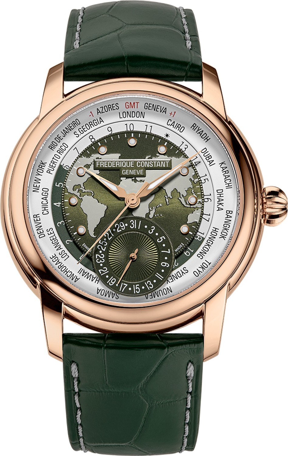 Cần thiết cho những người du lịch toàn cầu; chiếc đồng hồ Classic Worldtimer Manufacture có đĩa 24 giờ với chỉ báo ngày đêm và đĩa thành phố cho phép bạn theo dõi thời gian ở 24 thành phố lớn trên thế giới, tất cả đều có thể điều chỉnh bằng núm vặn. Vỏ ba phần bằng vàng hồng 18K được đánh bóng, và có mặt số màu kaki và bạc với bản đồ thế giới được dập nổi. Các vạch chỉ giờ bằng vàng được phủ chất phát quang màu trắng. Đi kèm với dây đeo bằng da cá sấu màu xanh đậm với đường chỉ khâu màu trắng nhạt. Thời gian dự trữ năng lượng 38 giờ. Phiên bản giới hạn 36 chiếc. Bộ máy FC-718. Công nghệ bộ máy: Tự động. Mô tả bộ máy: Được cung cấp năng lượng bởi sự giải phóng của lò xo lên dây cót, bộ máy cơ học không bao giờ cần pin. Bộ máy cơ tự động có một quả tạ dao động để lên dây cót nhờ chuyển động của cánh tay người đeo. Chức năng: Giờ, phút, giây, ngày và giờ thế giới. Quốc gia: Thụy Sĩ. Màu vỏ: Vàng 18k. Hình dạng vỏ: Tròn. Chất liệu vỏ: Vàng 18 karat. Chiều dài vỏ: 42mm. Độ dày vỏ: 12.15mm. Chiều rộng càng (mm): 22mm. Màu mặt số: Xanh lá cây. Chất liệu mặt số: Đồng thau. Kính: Kính sapphire chống phản quang. Mô tả kính: Chống va đập và vỡ - lớp phủ chống phản quang làm lệch hướng ánh sáng. Chất liệu dây đeo: Da cá sấu. Màu dây đeo: Xanh lá cây. Loại khóa: Khóa cài