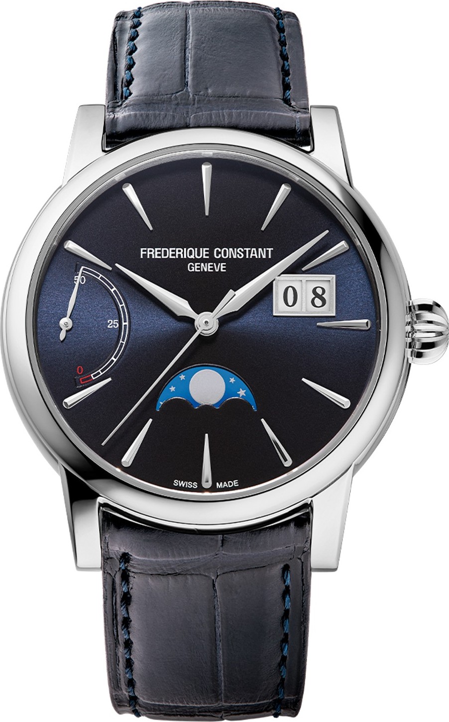 Mẫu đồng hồ Classic Power Reserve Big Date Manufacture có vỏ 40mm và được trang bị bộ máy FC-735 Manufacture với ba chức năng phức tạp: dự trữ năng lượng, ngày lớn và chu kỳ mặt trăng. Bộ máy FC-735. Công nghệ bộ máy Tự động. Quốc gia Thụy Sĩ. Mô tả bộ máy: Được vận hành bằng cách giải phóng lò xo đã lên dây, bộ máy cơ học không bao giờ cần pin. Bộ máy cơ tự động có một quả lắc dao động để lên dây cót bằng chuyển động của cánh tay người đeo. Chức năng: Chu kỳ mặt trăng, Giờ, Phút, Ngày lớn, Dự trữ năng lượng, Giây. Màu vỏ: Bạc. Hình dạng vỏ: Tròn. Chất liệu vỏ: Thép không gỉ. Chiều dài vỏ: 40mm. Độ dày vỏ: 12,19mm. Chiều rộng càng (mm): 20mm. Khả năng chống nước: WR50/5Bar/166ft. Màu mặt số: Xanh hải quân. Chất liệu mặt số: Đồng thau. Điểm nhấn mặt số: Các chi tiết mạ bạc. Tính năng mặt số: Vạch chỉ giờ; Kim dạ quang; Hiển thị chu kỳ mặt trăng; Hiển thị mức năng lượng dự trữ. Mặt kính: Kính sapphire chống phản quang. Mô tả mặt kính: Chống va đập và vỡ - lớp phủ chống phản quang giúp phản xạ ánh sáng. Loại dây đeo: Dây da. Chất liệu dây đeo: Da cá sấu. Màu dây đeo: Xanh dương. Loại khóa: Khóa cài.