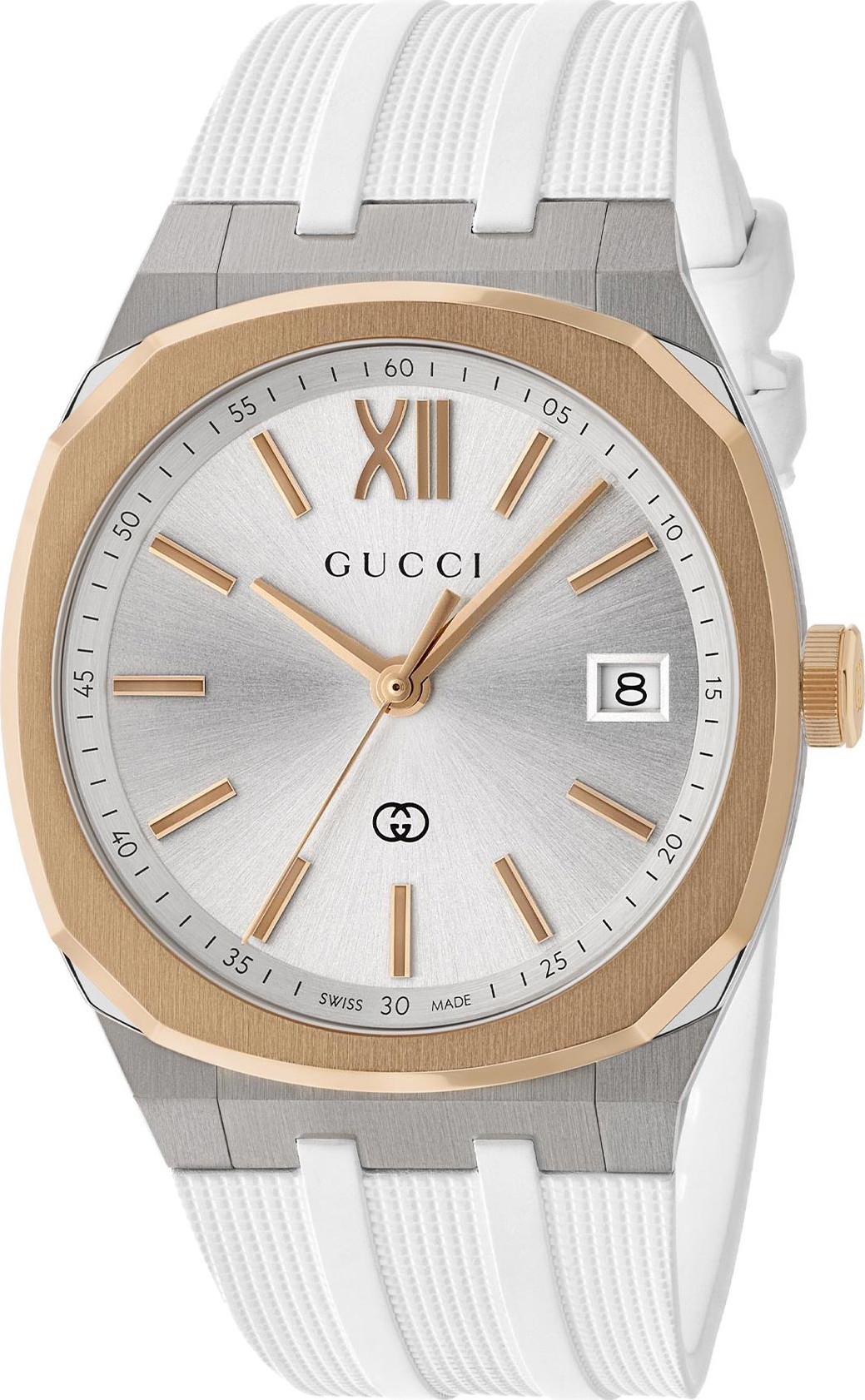 ộ sưu tập GUCCI 25H mới nhất sở hữu thiết kế tinh tế, với những chi tiết tinh tế làm nổi bật thiết kế thanh lịch của đồng hồ. Được trang bị bộ máy quartz, phụ kiện này nổi bật với dây đeo cao su trắng có thể thay thế và vỏ thép không gỉ với mặt số màu bạc. Vỏ thép không gỉ 36mm nhiều lớp. Viền mạ vàng hồng, mặt số màu bạc, chi tiết chữ G lồng vào nhau, logo Gucci và ô mở ngày. Mặt kính sapphire phủ lớp chống phản quang. Dây đeo cao su trắng có thể thay thế. Bộ máy quartz. 5 ATM (50 mét/164 feet). Kích thước cổ tay từ 5,5" đến 7,2".