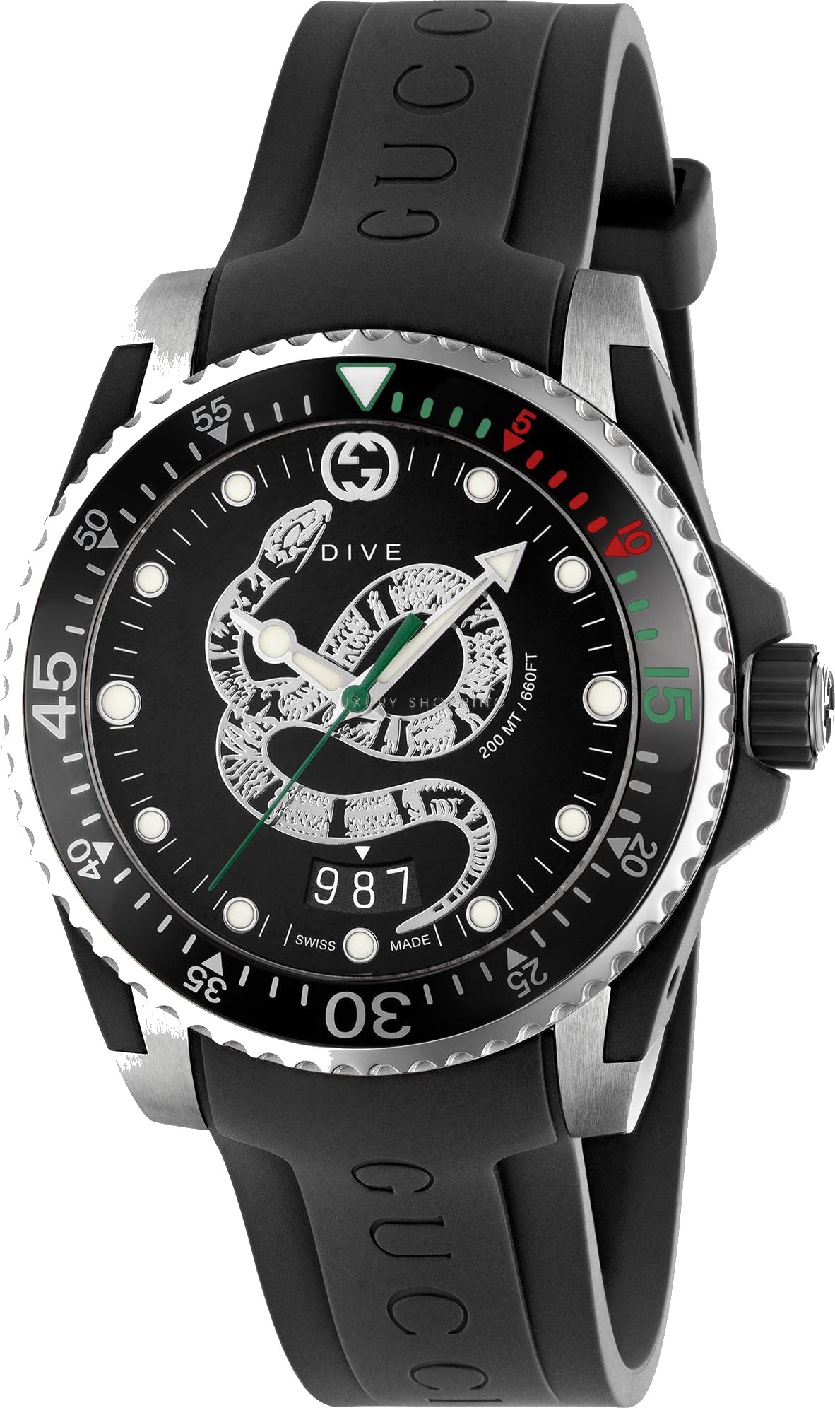 Đối với Cruise 2019, Gucci Dive kết hợp vẻ ngoài giản dị của dây đeo cao su có in logo với họa tiết mang tính biểu tượng của Ngôi nhà: Kingsnake. Họa tiết ngoằn ngoèo được đóng khung bằng vỏ thép.