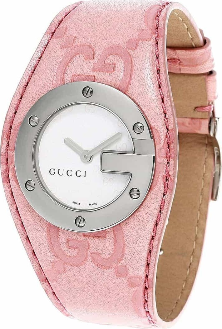 Thương hiệu Gucci Dành cho Nữ Bộ máy Quartz Kích thước vỏ 31 mm Chất liệu vỏ Thép không gỉ Mặt sau vỏ Rắn Hình dạng vỏ Tròn Màu mặt số Trắng Loại mặt số. Pha lê tông bạc Sapphire chống xước Vành: Cố định Núm vặn: Kéo / Đẩy Chất liệu dây đeo: Da Loại dây đeo / Màu sắc Dây đeo / Hồng Khóa Cài Khả năng chống nước 30 mét / 100 feet Xuất xứ Sản xuất tại Thụy Sĩ Chức năng Giờ, Phút.