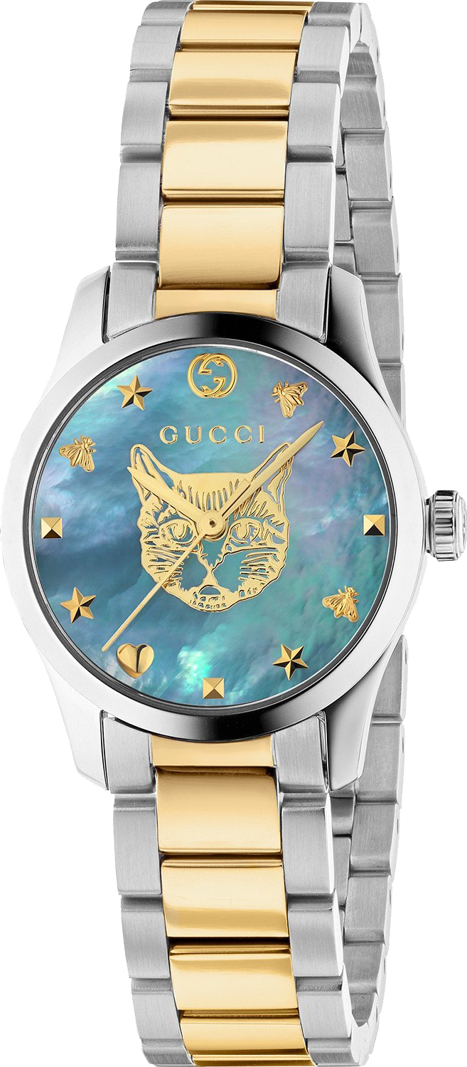 Mang hơi hướng sang trọng vui nhộn hơn, chiếc đồng hồ Gucci này thể hiện những vệt màu vàng và họa tiết quyến rũ trên mặt số. Từ bộ sưu tập G-Timeless.