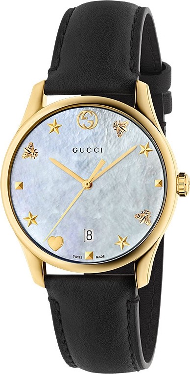 Mặt số xà cừ trắng với các cọc số hình chóp màu vàng vàng và họa tiết Gucci: chữ G, con ong, ngôi sao và trái tim lồng vào nhau