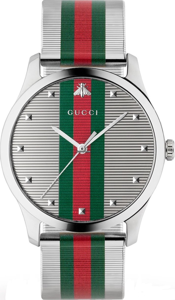 Sọc House Web, với sự kết hợp màu xanh lá cây và đỏ dễ nhận biết nhất, được in trên chiếc đồng hồ G-Timeless này dọc theo vòng đeo tay bằng lưới thép và tiếp tục trên mặt số trung tâm.