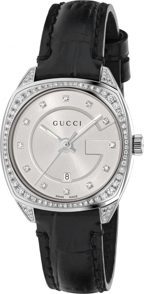 Vỏ thép không gỉ tông bạc với dây đeo bằng da màu đen. Vành thép không gỉ tông bạc cố định. Mặt số tông bạc với kim đồng hồ và vạch chỉ giờ kim cương. Hiển thị ngày ở vị trí 6 giờ. Bộ máy thạch anh. Nắp lưng chắc chắn. Kiểu dáng vỏ đệm, kích thước vỏ: 29 mm. Khả năng chống nước ở độ sâu 50 mét / 165 feet. Chức năng: ngày, giờ, phút, giây. Dòng GG2570. Kiểu dáng đồng hồ thanh lịch. Nhãn đồng hồ: Sản xuất tại Thụy Sĩ. Gucci GG2570 Mặt số kim cương tông bạc dành cho nữ.