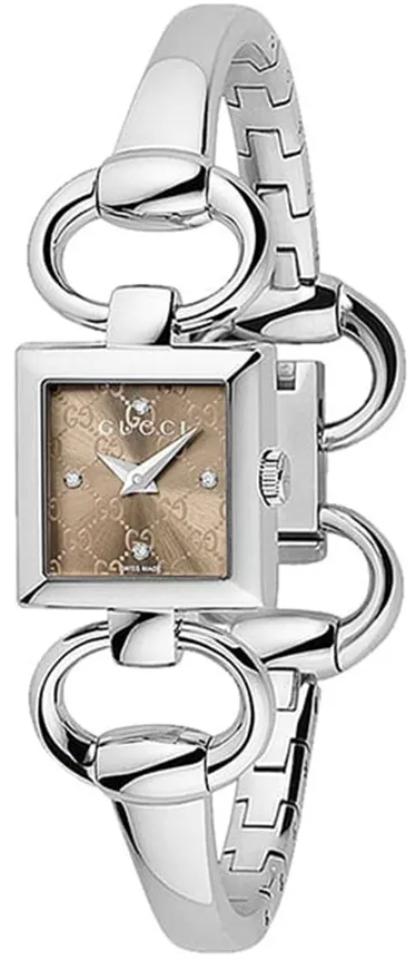 Chất liệu: Vỏ thép không gỉ hình vuông đánh bóng. Hình dạng vỏ: Tròn. Màu mặt số: Mặt số màu nâu/đồng với kim tông màu bạc và 4 vạch chỉ giờ bằng kim cương (0,01 carat). Bộ máy: Thạch anh Thụy Sĩ. Chức năng: Giờ, Phút. Chất liệu pha lê: Sapphire - Chống phản quang. Chiều dài vỏ: 19,0 mm. Chiều dài vỏ bao gồm cả vấu: 28 mm. Chiều rộng vỏ: 19,0 mm. Độ dày vỏ: 6,0 mm. Chất liệu vành bezel: Thép không gỉ. Chức năng vành bezel: Cố định. Khối lượng: 39,0 g. Khả năng chống nước: 30m / 100ft (không thích hợp để tiếp xúc lâu với nước, ví dụ như bơi lội, tắm). Chất liệu núm vặn: Thép không gỉ, có khía với logo GUCCI. Độ dày núm vặn: 2,50. Đường kính núm vặn: 3,92 mm. Chiều rộng dây đeo đồng hồ: 5,25 - 18,25 mm. Dây đeo Độ dày: 4.0 mm