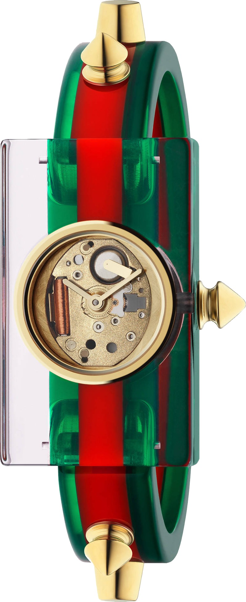 Vỏ Plexiglas trong suốt với Web màu xanh lá cây và đỏ, mặt số khung xương màu vàng, vòng tay Plexiglas Web màu xanh lá cây và đỏ trong suốt với đinh tán PVD vàng vàng