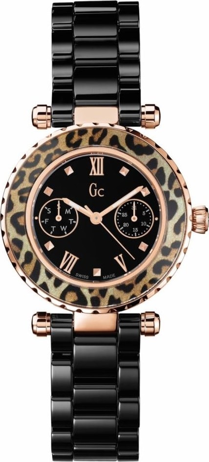 Vỏ thép không gỉ tông vàng hồng với vòng đeo tay bằng gốm màu đen. Viền cố định. Mặt số màu đen với kim màu vàng hồng và vạch số giờ La Mã. Loại quay số: Analog. Hiển thị ngày ở vị trí 3 giờ. Hai mặt số phụ ngày và thứ trong tuần.