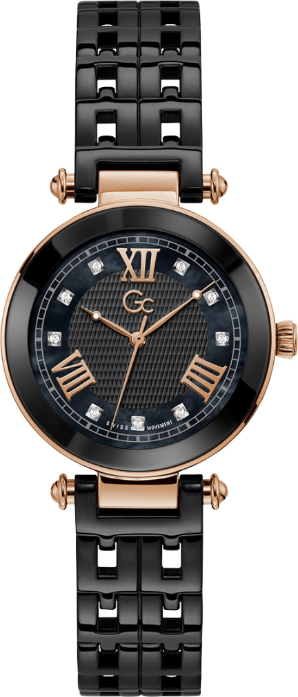 Hãy sành điệu và tự tin với chất liệu gốm mịn màu đen huyền trên vỏ có tông màu vàng hồng kích thước nhỏ với mặt số guilloche màu đen phù hợp được chọn lọc với các điểm nhấn bằng vàng hồng ở kim và chữ số La Mã cũng như chỉ số pha lê Swarovski®, trên dây đeo bằng gốm đa liên kết phức tạp có kẹp bướm.