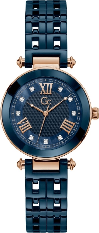 Hãy sành điệu và tự tin với chất liệu gốm mịn màu xanh mòng két trên vỏ có tông màu vàng hồng cỡ nhỏ với mặt số họa tiết hoa văn màu xanh lam phù hợp được chọn lọc với các điểm nhấn bằng vàng hồng trên kim và chữ số La Mã cũng như chỉ số pha lê Swarovski®, trên dây đeo bằng gốm đa liên kết phức tạp có kẹp bướm.