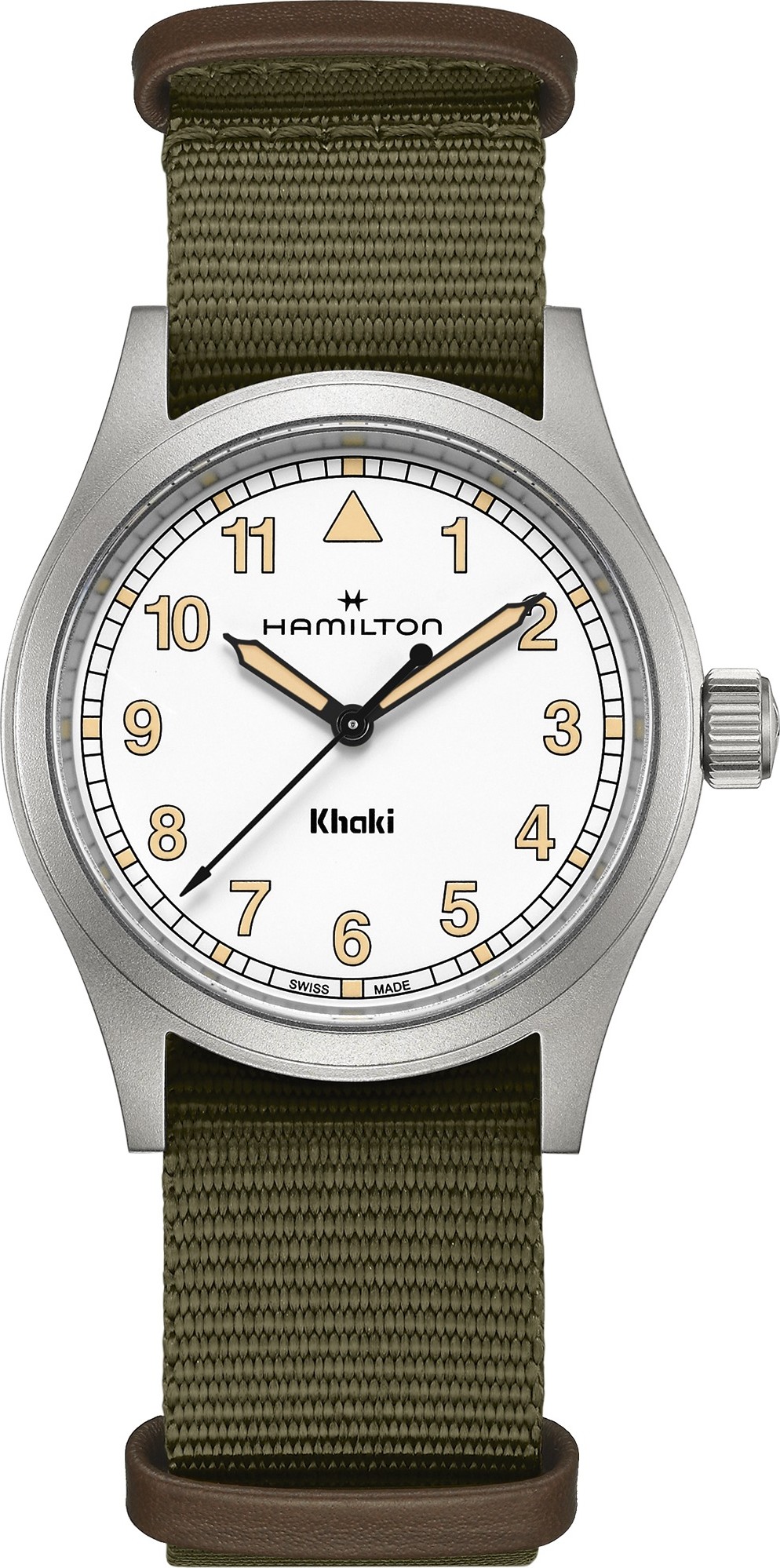 Đồng hồ Khaki Field Quartz thể hiện sự trở lại với di sản quân sự của Hamilton thông qua thiết kế đơn giản. Mặt số nổi bật với kiểu chữ rõ ràng, số Ả Rập thẳng hơn và vòng phút "kiểu đường sắt". Bảng màu được thiết kế tinh tế, với mặt số trắng bóng bẩy được tô điểm bởi các cọc số Super-LumiNova® màu radium cổ điển. Đồng hồ đi kèm dây đeo NATO bằng vải dệt màu xanh lá cây và vòng da nâu - hoàn hảo cho chuyến phiêu lưu tiếp theo của bạn trên chiến trường. Bộ máy F06.105. Bộ sưu tập Khaki Field. Bộ máy Quartz. Kích thước vỏ 38mm. Độ dày (mm) 8.3. Màu mặt số Trắng. Chất liệu vỏ: Thép không gỉ. Tinh thể Sapphire. Chiều rộng càng 20mm. Độ chống nước: 5 bar (50m)/73 psi (164ft). Mã dây đeo: H6006941021. Kiểu dây đeo: Vải dệt. Kiểu khóa: Khóa cài. Chiều rộng khóa 20mm