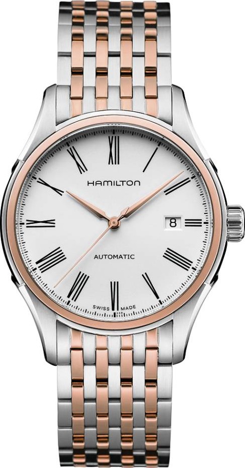 Vỏ thép không gỉ tông màu bạc với vòng đeo tay bằng thép không gỉ hai tông màu (tông màu bạc và vàng hồng PVD). Viền thép không gỉ PVD vàng hồng cố định. Mặt số màu trắng với các kim hình dạng chữ alpha tông vàng hồng và vạch số giờ La Mã. Điểm đánh dấu phút xung quanh vành ngoài. Loại quay số: Analog. Hiển thị ngày ở vị trí 3 giờ. Bộ máy tự động Hamilton Calibre H-10, dựa trên ETA C07.111, chứa 25 viên Ngọc, hoạt động ở tần số 21600 vph và có khả năng dự trữ năng lượng khoảng 80 giờ. Tinh thể sapphire chống trầy xước. Kéo/đẩy vương miện. Vỏ sau chắc chắn. Kiểu dáng vỏ tròn, kích thước vỏ: 40 mm, độ dày vỏ: 10,41 mm. Chiều rộng dây đeo: 20,3 mm, chiều dài dây đeo: 8 inch. Nếp gấp ẩn trên móc cài. Chống nước ở độ sâu 50 mét / 165 feet