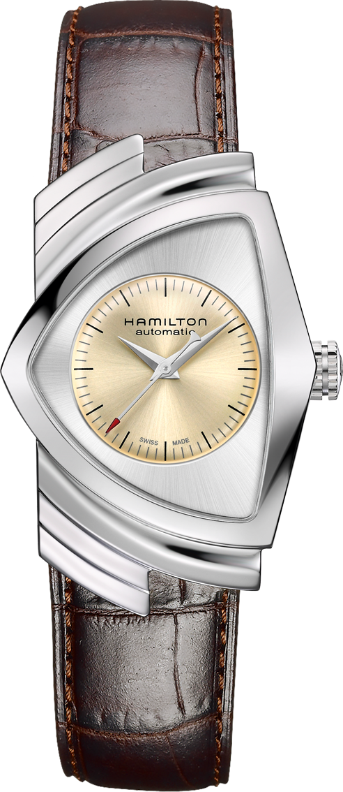 Vỏ bất đối xứng của chiếc Ventura mang tính biểu tượng là một phần không thể nhầm lẫn trong thiết kế của Hamilton ngay từ năm 1957. Được bắt chước nhiều nhưng không bao giờ có đối thủ, Ventura vẫn là một yếu tố lâu dài trong lịch sử đáng tự hào của Hamilton. Mẫu này có mặt số tinh tế và bộ chuyển động tự động chất lượng của Thụy Sĩ.