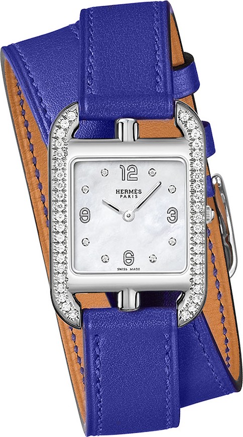 Dây đeo "double tour" bằng da bê màu xanh điện mượt mà quấn quanh cổ tay hai vòng.