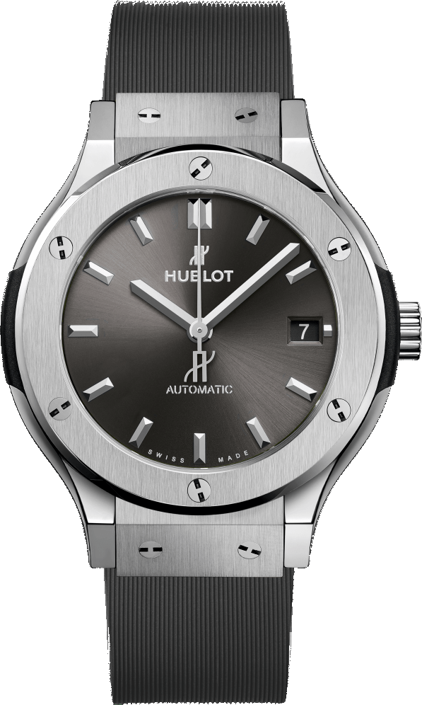 Titanium được Hublot sử dụng rộng rãi, đặc biệt vì độ nhẹ của nó. Nó thể hiện mối quan hệ tốt nhất giữa sức cản và trọng lượng của bất kỳ vật liệu nào, khiến nó trở thành vật liệu cực kỳ phổ biến, đặc biệt là trong ngành hàng không. Nó còn nổi bật với khả năng chống ăn mòn và quán tính khi tiếp xúc với da. Hublot chỉ sử dụng titan loại 5 chất lượng cao, loại mạnh nhất hiện có. Sau khi được đánh bóng, vật liệu này vẫn giữ được ánh kim loại hơi xanh.