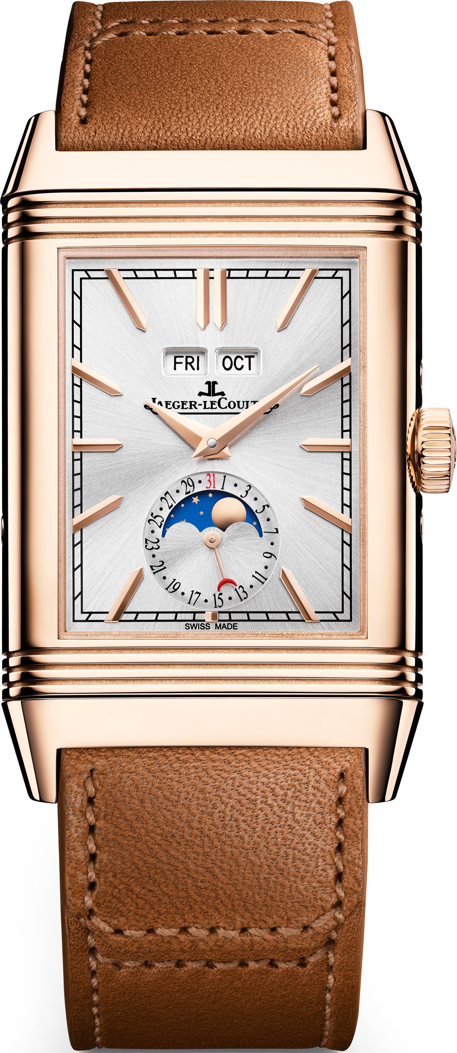 Được trang bị bộ máy Calibre 853 do hãng tự sản xuất với cơ chế lên dây thủ công, kết hợp giữa thiết kế Duoface và lịch hoàn chỉnh, chiếc đồng hồ Reverso Tribute Duoface Calendar mang đến sự tương phản tuyệt vời ở cả hai mặt. Ở mặt trước, chiếc đồng hồ tái hiện lại những đường nét thẩm mỹ của bộ sưu tập lấy cảm hứng từ phong cách Art Deco ra mắt năm 1931 với sự thanh lịch và tinh tế: các đường gờ đặc trưng, vạch chỉ giờ nổi, kim Dauphine... Ở vị trí 6 giờ, kim chỉ ngày tháng hiển thị chu kỳ mặt trăng được tô điểm bằng một kim nhỏ có đầu hình lưỡi liềm màu đỏ tươi. Ở mặt sau, mặt số mới với lớp hoàn thiện tia nắng mặt trời có màu xám đậm quyến rũ và một đĩa Ngày/Đêm, được tích hợp hoàn hảo vào thiết kế mới. Thanh lịch và vượt thời gian, chiếc đồng hồ đi kèm với một cặp dây đeo (và khóa) có thể thay thế được thiết kế bởi Casa Fagliano. Với chất liệu da hoặc kết hợp (vải và da), chúng mang đến cho mẫu đồng hồ này một nét cổ điển mạnh mẽ. Vỏ vàng hồng 750/1000 (18 carat). Kích thước (Dài x Rộng): 49,4 x 29,9 mm, L: Khoảng cách giữa hai càng. Độ dày: 10,9 mm. Khả năng chống nước: 3 bar. Mặt số: Vạch chỉ giờ đính nổi, màu xám bạc, chải tia nắng. Kim trước kiểu Dauphines. Kim sau kiểu Dauphines. LOẠI MÁY: Lên dây cót thủ công. Chức năng: Tháng, Chu kỳ mặt trăng, Chỉ báo ngày/đêm, Ngày, Giờ - Phút, Múi giờ thứ hai, Thứ. Độ dày: 5,15 mm. Tần số dao động (Hz): 21600. Tần số (Hz): Dao động cân bằng (Hz). 3. Khả năng dự trữ năng lượng. Khám phá thêm 42 giờ. Số linh kiện: 223. Số chân kính: 19. Số hộp cót: 1. Dây đeo có thể thay thế: Được chế tác với công nghệ tháo lắp nhanh giúp thay đổi dây đeo dễ dàng. Chiều dài dây tiêu chuẩn ở vị trí 12 giờ: 75mm. Chiều dài ở vị trí 6 giờ: 120mm. Chiều rộng càng nối dây: 22mm. Khóa cài: Khóa ghim vàng hồng 750/1000 (18 carat). Chiều rộng khóa cài: 20mm.