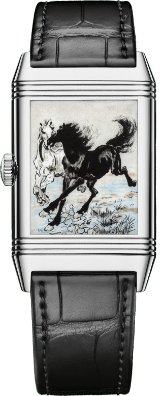 Kể từ khi ra đời năm 1931, chiếc đồng hồ hai mặt mang tính biểu tượng này đã chứng minh là một bức tranh nghệ thuật đầy cảm hứng. Để tôn vinh nghệ thuật tranh thủy mặc và trân trọng tinh thần của năm Ngựa, các nghệ nhân Métiers Rares™ của chúng tôi đã tái hiện bức tranh "Cùng nhau chạy" của Xu Beihong ở mặt sau của chiếc Reverso Tribute Enamel. Được thực hiện bằng kỹ thuật vẽ men thu nhỏ với những nét cọ sống động và nhiều sắc thái mực khác nhau, kiệt tác này đã nắm bắt được bản chất của năng lượng hoang dã và sức sống mãnh liệt được thể hiện bởi những chú ngựa biểu tượng này. Mặt số, được chạm khắc họa tiết hạt lúa mạch và phủ lớp men Grand Feu màu xanh lam trong suốt, tạo nên sự tương phản nổi bật với tác phẩm nghệ thuật ở mặt sau. Việc tái tạo tỉ mỉ tác phẩm nghệ thuật mang tính biểu tượng này và việc chế tác mặt số đòi hỏi hơn 80 giờ lao động thủ công, với nhiều lần nung trong lò ở nhiệt độ 800°C để đạt được những biến thể sắc độ tinh tế của men và độ sâu sống động của mặt số. Vỏ: Vàng trắng 750/1000 (18 carat). Kích thước (Dài x Rộng): 45,6 x 27,4 mm, L: Khoảng cách giữa hai càng. Độ dày: 9,73 mm. Khả năng chống nước: 3 bar. Mặt số: Vạch chỉ giờ đính nổi, màu xanh lam, men Guilloché. Kim: Kiểu Dauphine. LOẠI MÁY: Lên dây cót thủ công. Chức năng: Giờ - Phút. Độ dày: 2,94 mm. Tần số dao động: 21600 dao động/giờ. Tần số (HZ): 3. Thời gian dự trữ năng lượng: 42 giờ. Số linh kiện: 108. Số chân kính: 19. Số hộp cót: 1. Dây đeo: Có thể thay thế: Được chế tác với công nghệ tháo lắp nhanh giúp thay đổi dây đeo dễ dàng. Chiều dài dây tiêu chuẩn. Chiều dài dây đeo ở vị trí 12 giờ: 75mm. Chiều dài dây đeo ở vị trí 6 giờ: 120mm. Chiều rộng càng dây: 20mm. Khóa gập đôi. Vàng trắng 750/1000 (18 carat). Chiều rộng khóa: 18mm.