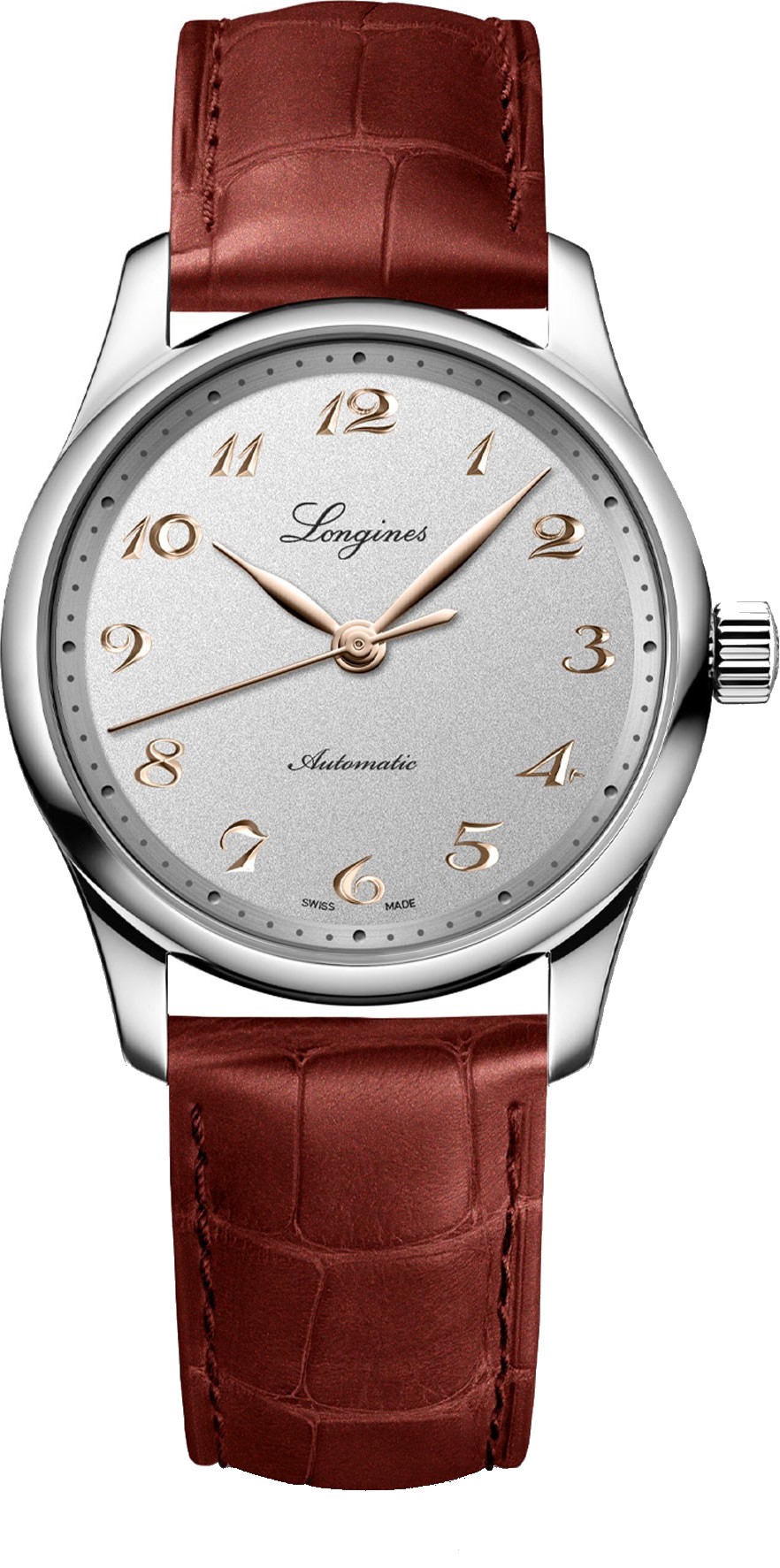 Bộ sưu tập Longines Master đại diện cho đỉnh cao của nghệ thuật chế tác đồng hồ và sự thanh lịch vượt thời gian. Dòng sản phẩm mang tính biểu tượng này bao gồm nhiều mẫu được chế tác tỉ mỉ, mỗi mẫu đều thể hiện cam kết vững chắc của Longines đối với phong cách bền bỉ và sự xuất sắc về mặt kỹ thuật. Từ sự đơn giản cổ điển của mặt số đến những chuyển động cơ học phức tạp bên trong, mọi chi tiết đều toát lên vẻ sang trọng tinh tế. Được trang trí bằng những chức năng phức tạp hay thiết kế thanh lịch, bóng bẩy, những chiếc đồng hồ này là minh chứng cho di sản và chuyên môn chế tác đồng hồ của Longines. Hình dạng: Tròn Chất liệu: Thép không gỉ. Mặt kính sapphire chống xước với nhiều lớp chống phản quang ở cả hai mặt. Kích thước: 34,00 mm. Khoảng cách từ vấu này đến vấu kia: 18 mm. Khoảng cách từ vấu này đến vấu kia: 41,70 mm. Độ dày: 9,20 mm. Khả năng chống nước ở độ sâu 3 bar. Trọng lượng: 54,9 g. Màu mặt số: Bạc. Vòng giờ: Chữ số Ả Rập được khắc. Kim: Hồng. Loại chuyển động: Tự động. Bộ máy L888. Bộ máy cơ tự động, tần số dao động khoảng 25.200 lần/giờ và dự trữ năng lượng 72 giờ, với dây tóc silicon đơn tinh thể. Dây đeo bằng da cá sấu. Màu sắc: Đỏ. Khóa: Khóa gập an toàn ba nấc và cơ chế mở bằng nút bấm.